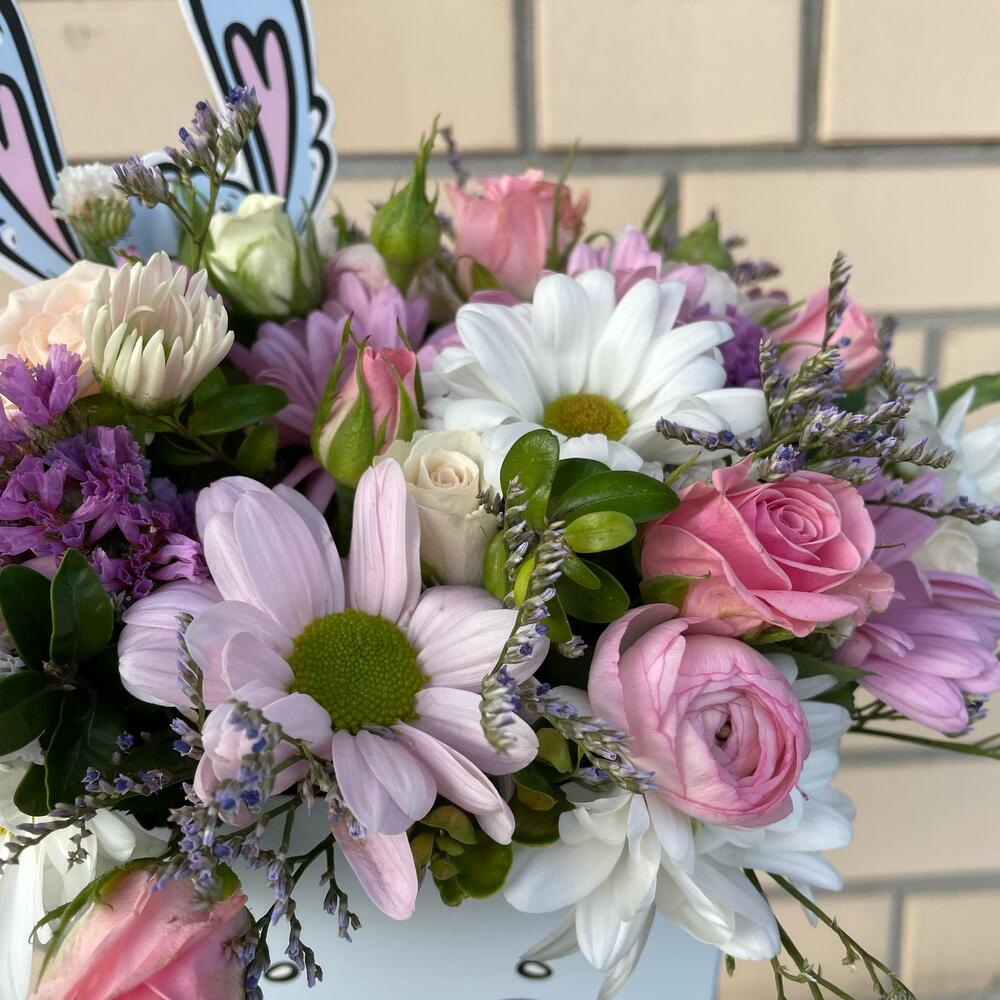 Роза кустовая – 2 шт.Хризантема кустовая – 3 шт.Лимониум – 2 шт.Статица – 2 шт.Ранункулюс – 1 шт.Самшит – 1 шт.Губка флористическая – 1 шт.коробка для цветов – 1 шт.