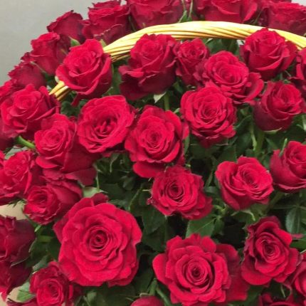 Роза красная – 101 шт.Корзина плетеная – 1 шт.Оазис флористический – 4 шт.Лента атласная – 1 шт.