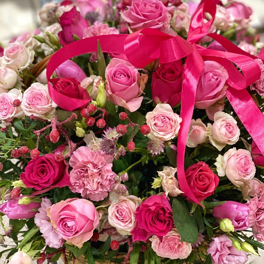 Роза малиновая – 20 шт.Роза розовая – 13 шт.Роза кустовая пионовидная – 4 шт.Астранция – 5 шт.Диантус сортовой – 10 шт.Тюльпан – 8 шт.Хиперикум – 4 шт.Лизиантус алиса пинк – 6 шт.Фисташка – 8 шт.Корзина плетеная – 1 шт.Оазис флористический – 3 шт.Упаковка – 1 шт.бант атласный – 1 шт.