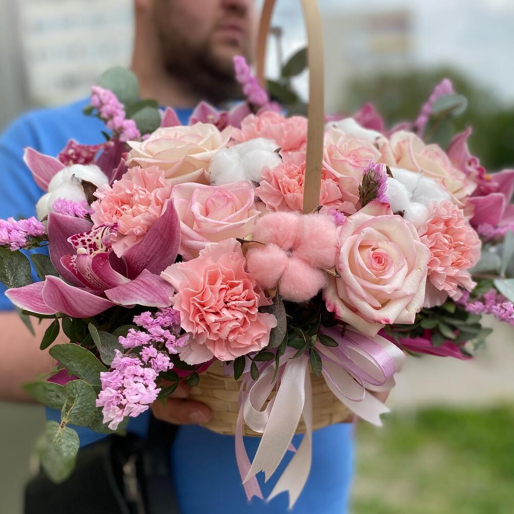Орхидея Цимбидиум – 5 шт.Статица – 7 шт.Роза – 5 шт.Зелень – 10 шт.Лента атласная – 10 шт.Корзина плетеная – 1 шт.Хлопок натуральный – 5 шт.гвоздика диантус – 5 шт.