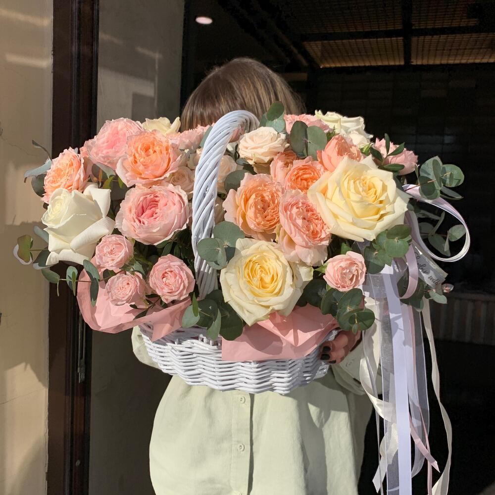 Корзина с пионовидными лилиями, полевыми маттиолами и розами