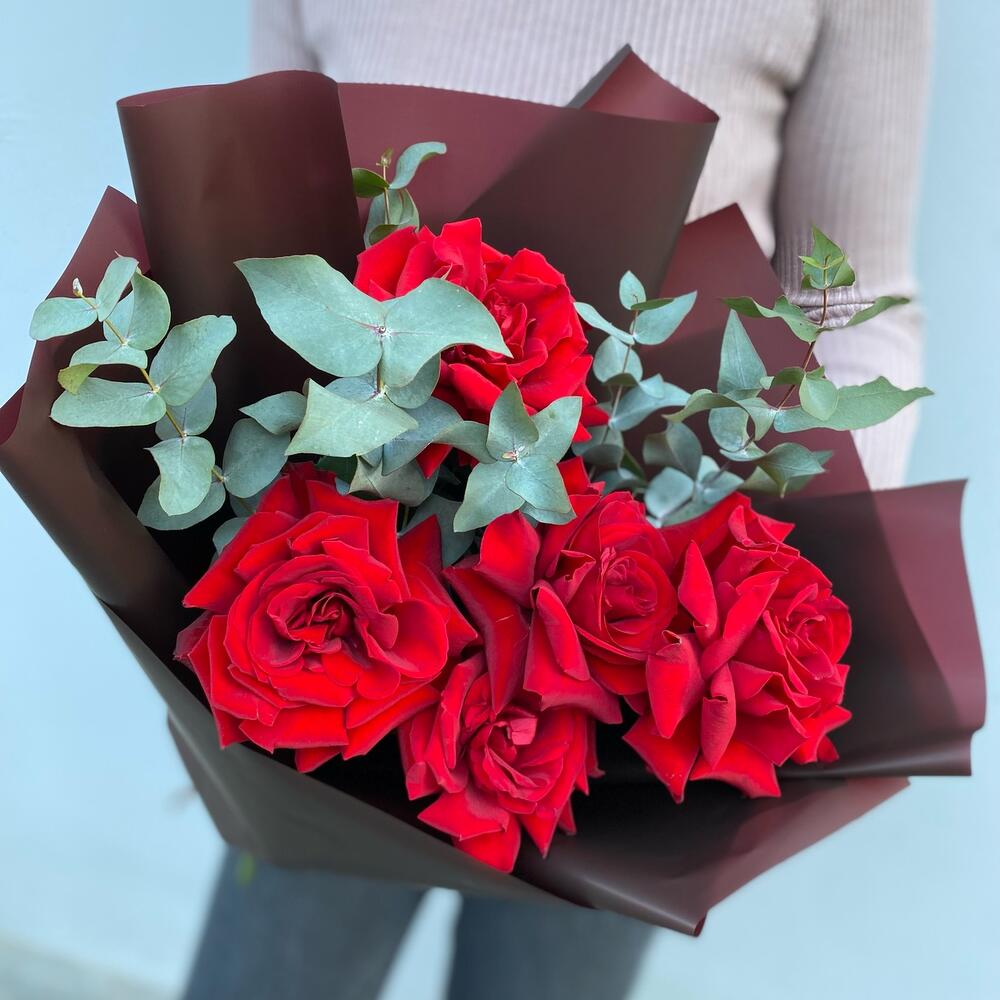 Эвкалипт – 1 шт.Лента атласная – 1 шт.Роза Freedom – 5 шт.Пленка матовая – 1 шт.