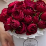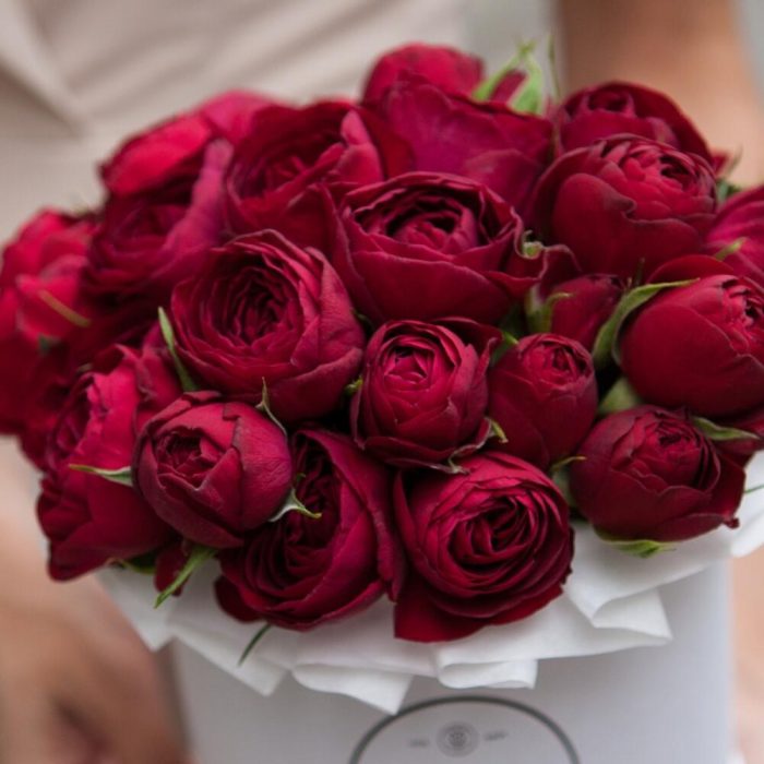 Красные пионовидные розы в коробке