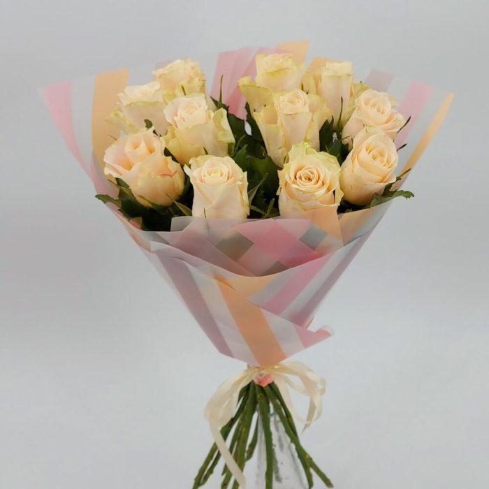 Нежные кремовые розы в стильном монобукете. Такой букет всегда уместен и подойдёт для любого повода: День Рождения, именины, годовщина свадьбы, рождение ребенка, 8 марта, День Святого Валентина, выпускной и т.д. Можно вручить маме, сестре, подруге, коллеге, учителю, любимой.