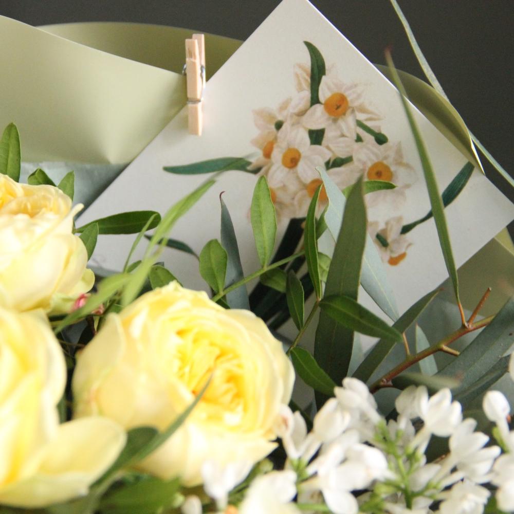 Роза кустовая пионовидная – 2 шт.Нарцисс – 2 шт.Сантини – 4 шт.Гвоздика – 4 шт.Эвкалипт – 5 шт.Фисташка – 2 шт.Мимоза – 2 шт.Маттиола – 1 шт.Сирень – 2 шт.