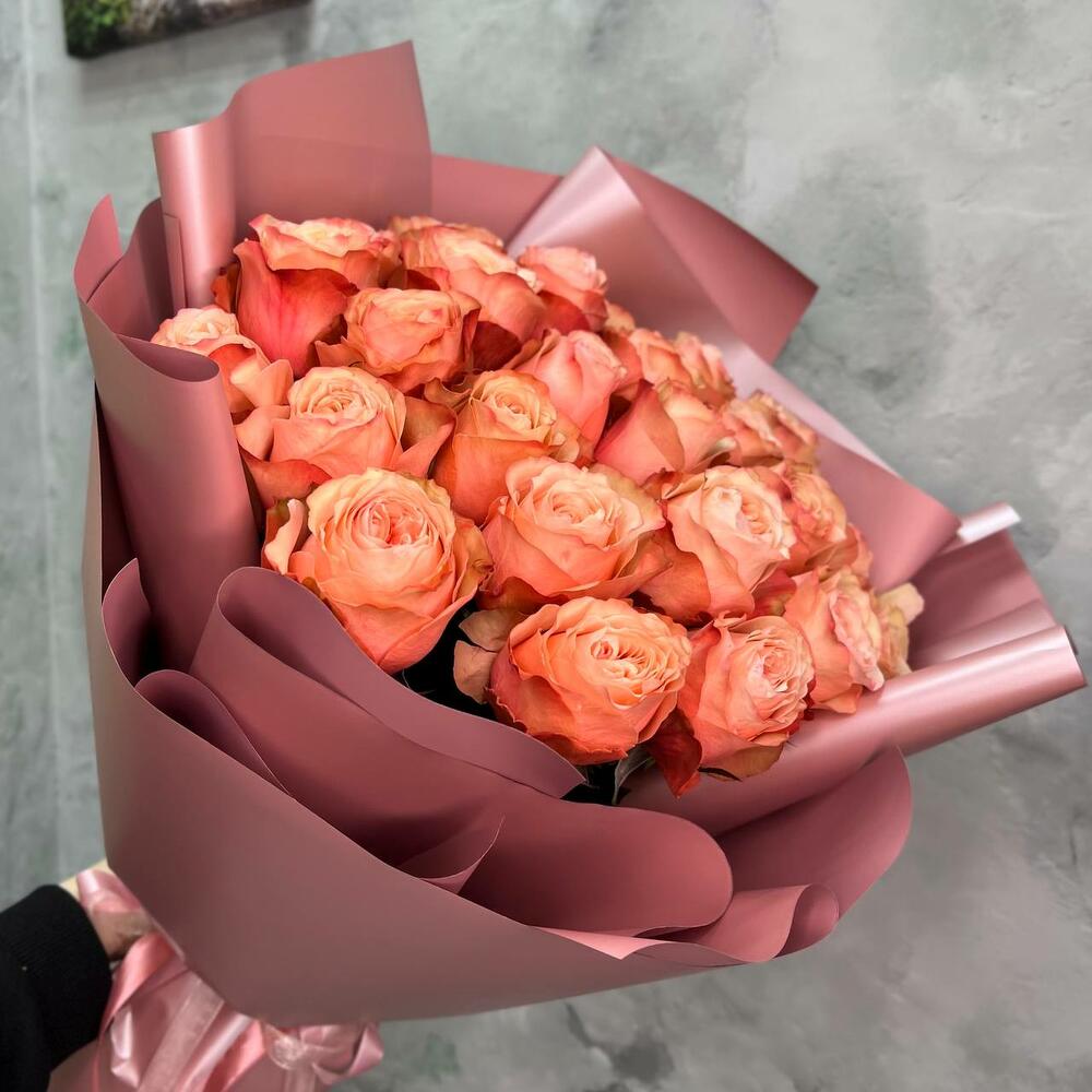 Пионовидная роза кахала – 25 шт.Упаковка дизайнерская – 5 шт.Лента атласная – 2 шт.
