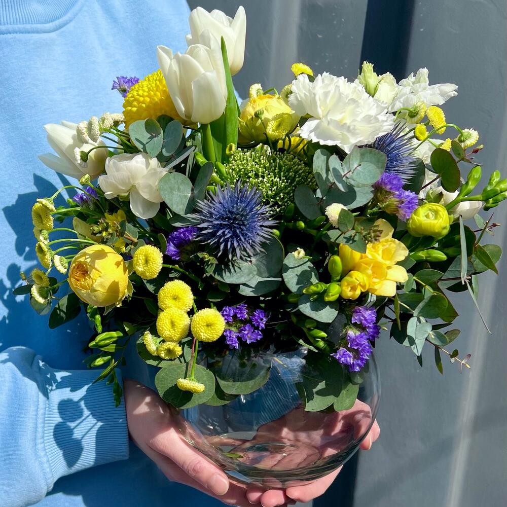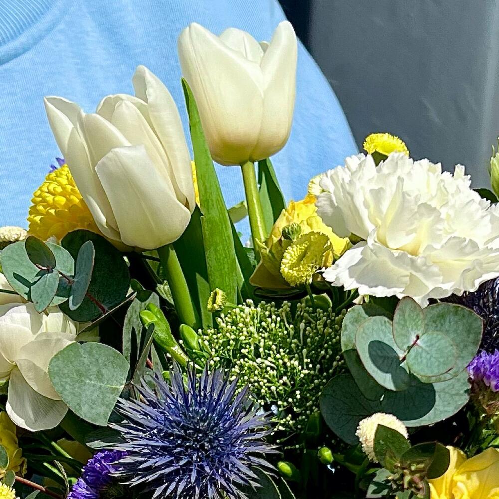 Статица – 1 шт.Трахелиум – 1 шт.Тюльпан – 3 шт.Фрезия – 2 шт.Диантус – 4 шт.Матрикария – 2 шт.Ваза стекло – 1 шт.Роза кустовая пионовидная – 1 шт.комплимент от polyanka – 1 шт.эрингим – 1 шт.
