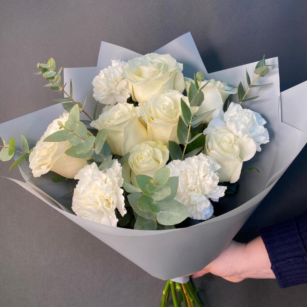 роза мондиаль белая – 7 шт.диантус белый сортовой – 4 шт.эвкалипт ценария большая ветка – 1 шт.Упаковка дизайнерская – 3 шт.