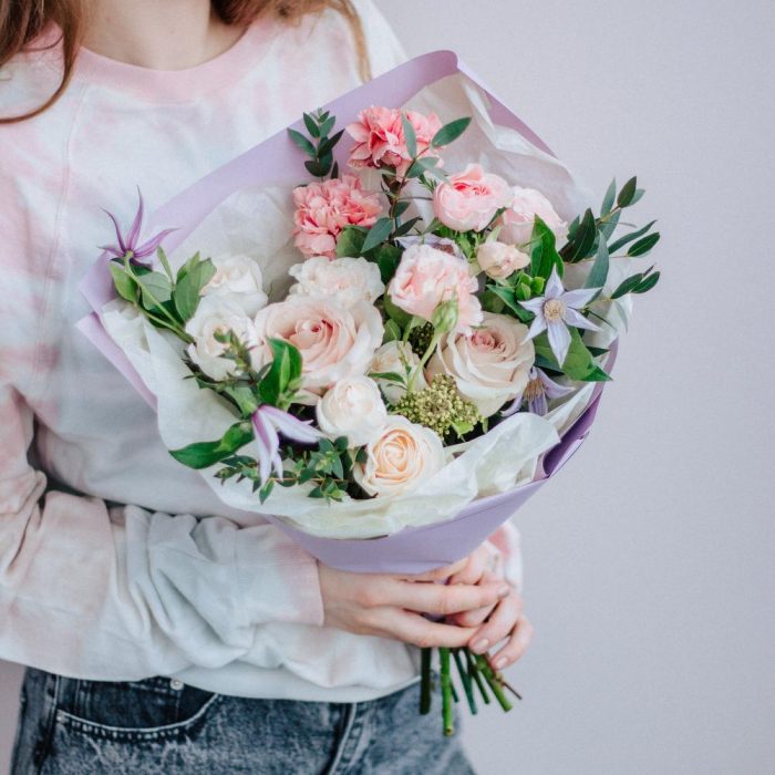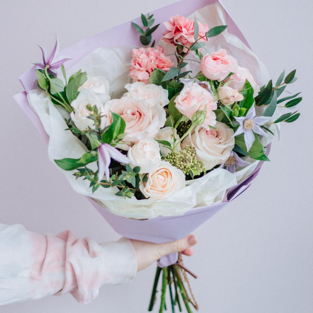 Клематис – 1 шт.Роза кустовая – 2 шт.Диантус сортовой – 3 шт.Роза Эквадор – 2 шт.Упаковка дизайнерская – 1 шт.