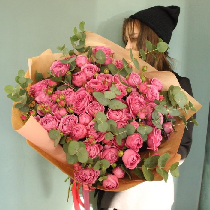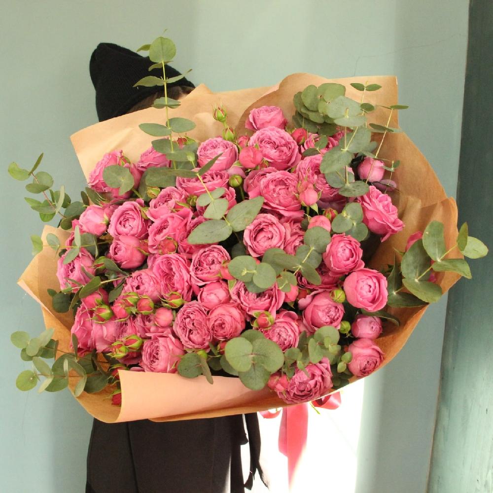 Восхитительный огромный букет из пятнадцати кустовых пионовидных роз малинового цвета и веточками ароматного эвкалипта.Ширина букета около 50 смВысота букета около 60 смСтильное цветочное решение для любого случая.