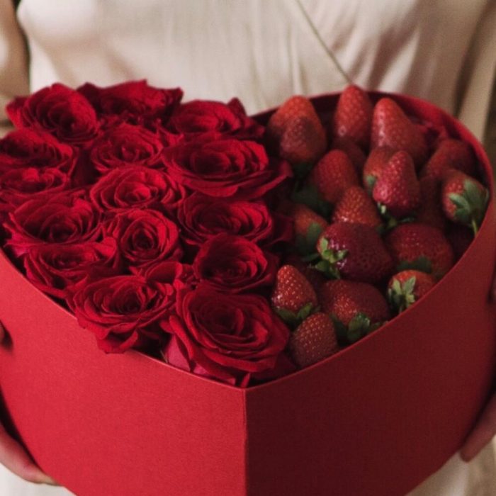 Шляпная коробка – 1 шт.Роза – 15 шт.Клубника – 300 гр.