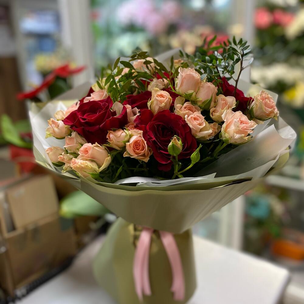 Роза – 7 шт.Роза кустовая – 10 шт.зелень декоративная – 3 шт.Упаковка дизайнерская – 2 шт.