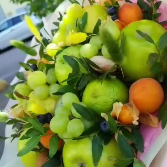 Виноград – 150 гр.Киви – 2 шт.Яблоко – 6 шт.Лайм – 2 шт.Физалис – 6 шт.Груша – 2 шт.Голубика – 15 гр.Лагурус – 5 шт.Транспортировочная коробка – 1 шт.Орех пекан – 5 шт.зелень фисташки – 3 шт.абрикос или мандарины – 6 шт.