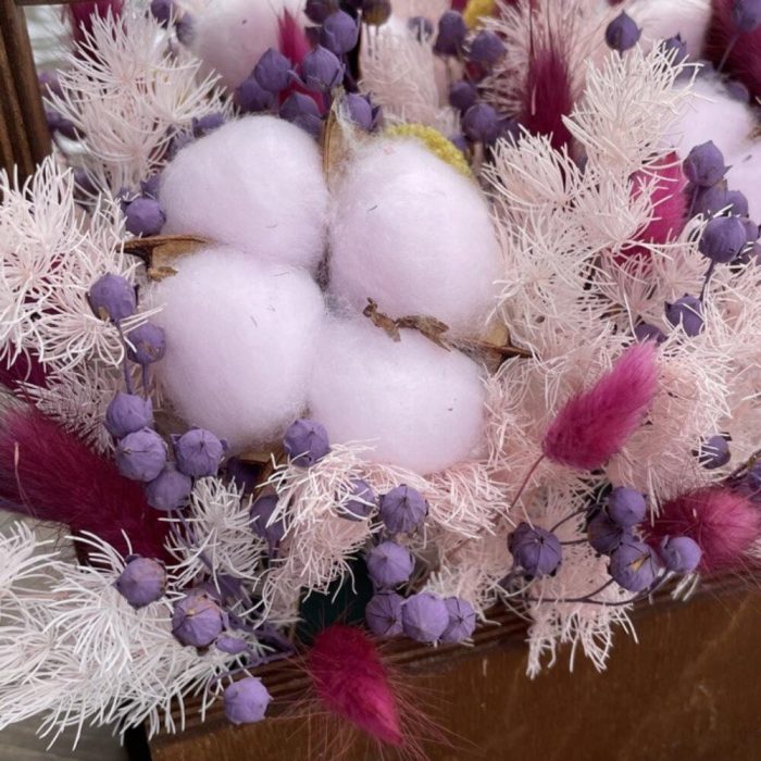 Хлопок – 6 шт.аспарагус стабилизированный – 3 шт.Краспедия – 5 шт.лëн – 10 шт.Лагурус – 20 шт.Ящик деревянный – 1 шт.Оазис флористический – 1 шт.