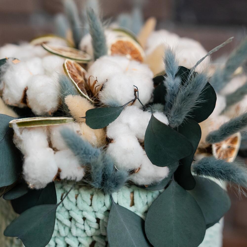 Хлопок натуральный – 25 шт.Эвкалипт стабилизированный – 3 шт.Лагурус (сухоцвет) – 30 шт.Шляпная коробка – 1 шт.дольки лайма – 15 шт.вязанка ручной работы – 1 шт.