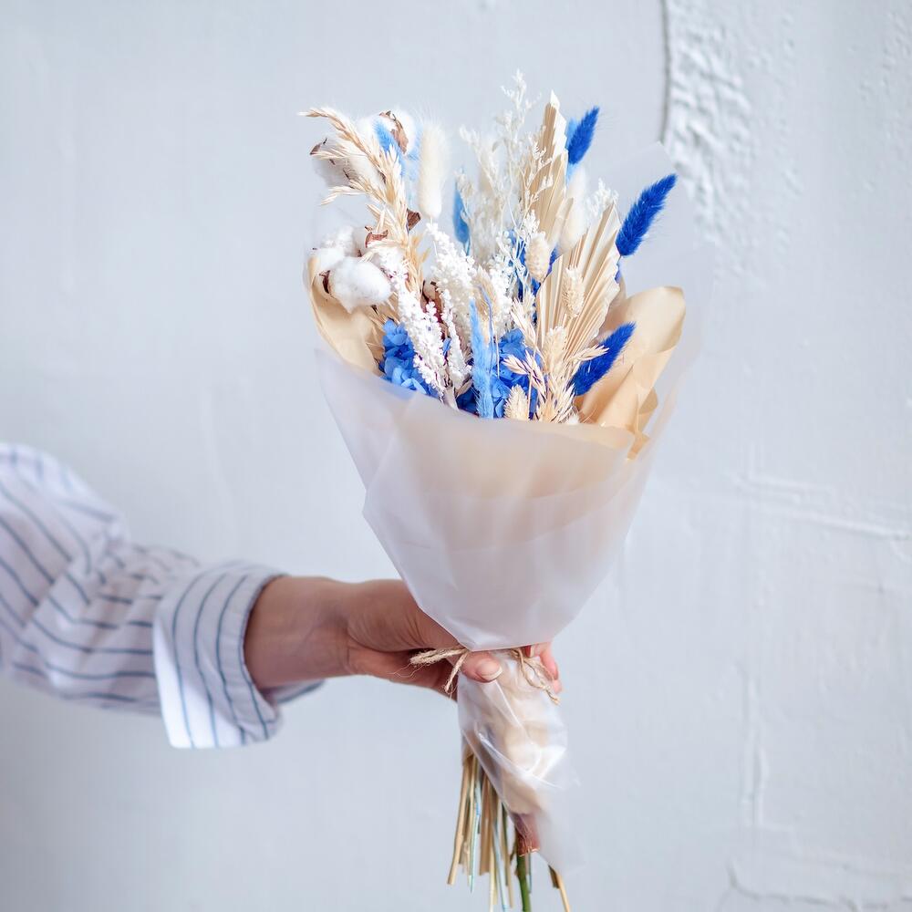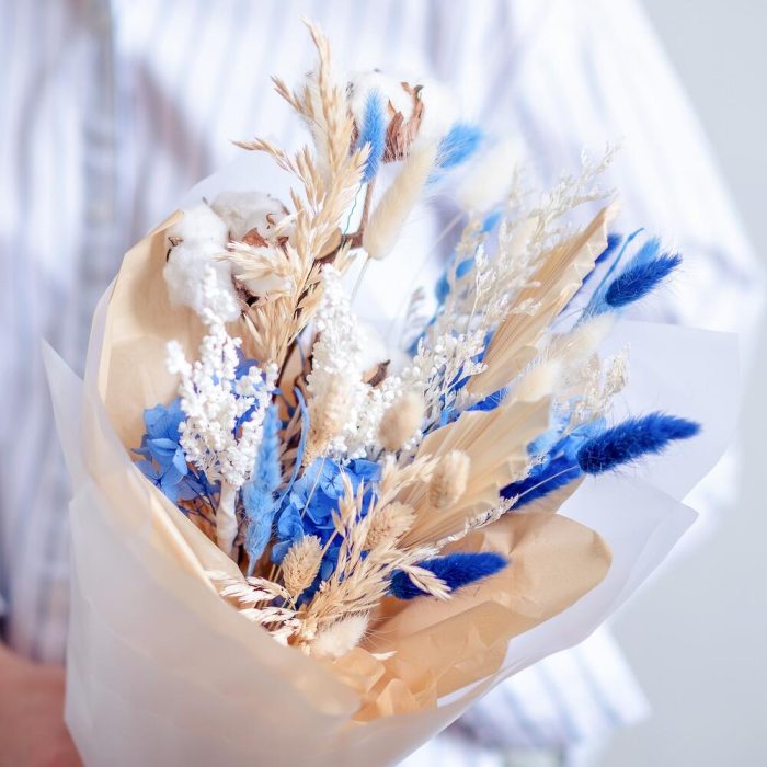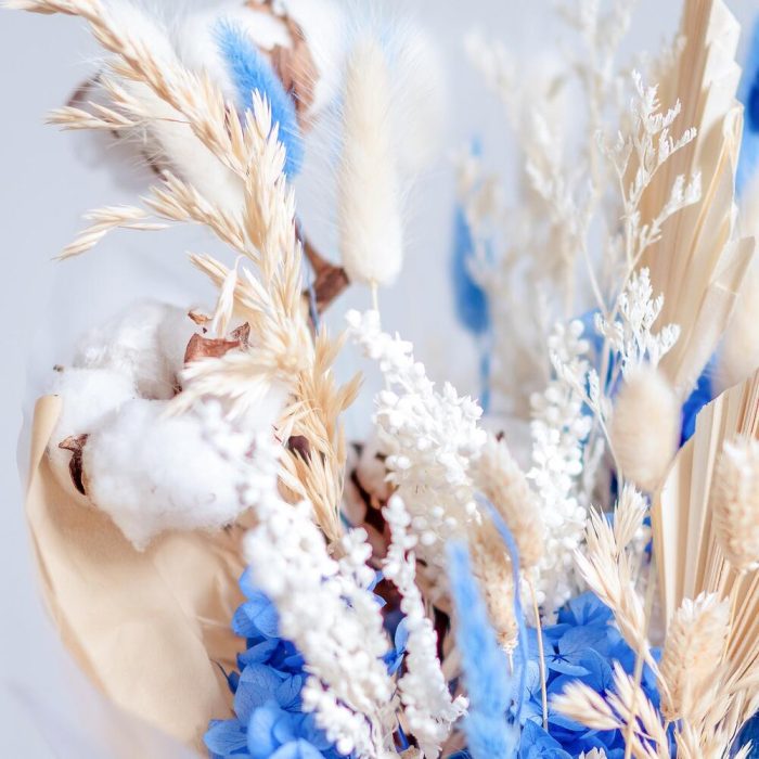 «Лавандовое созвездие» Букет из розы, гвоздики, статица и хлопка
