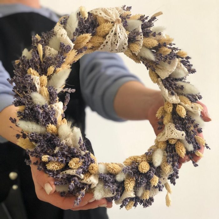 лаванда пучок (сухоцвет) – 4 шт.лагурус пучок – 10 шт.фаларис пучок – 10 шт.Основа для венка – 1 шт.Лента Кружево – 5 шт.